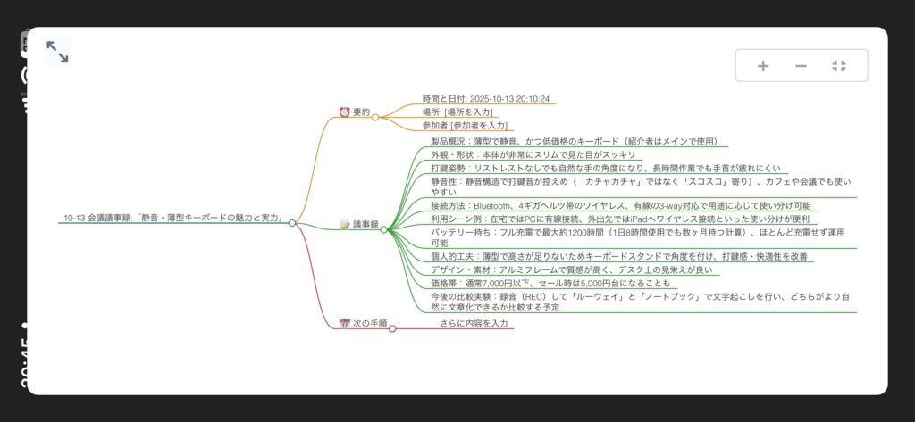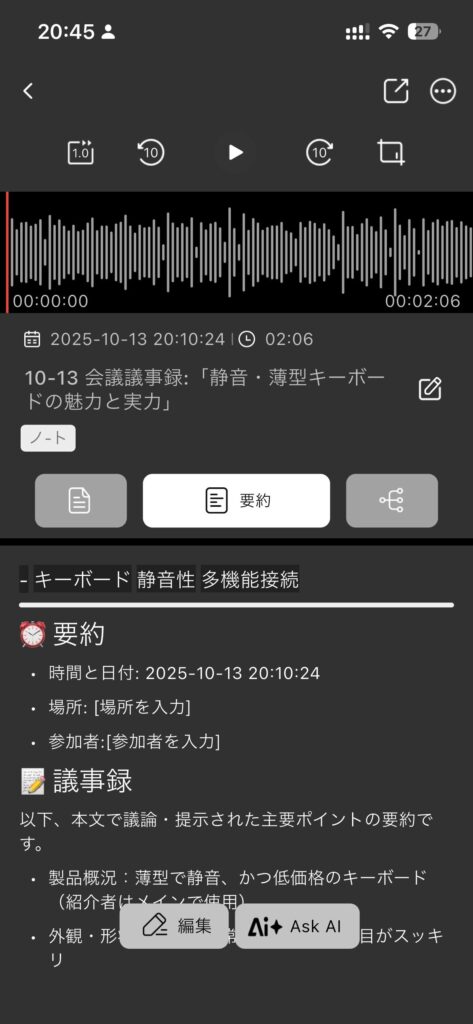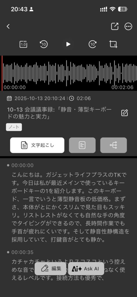 もちろん、滑舌や環境音など音声の質の問題もあるかもしれませんが、全体的に見ると、まだ実用レベルには届いていないという印象です。これは、Rec10自体の録音性能というより、搭載されているAIモデル(ChatGPTの文字生成精度)の問題かもしれません。