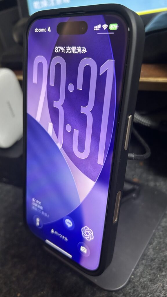 これまでは、安い透明ケースにMagSafeリングを磁力で貼り付けていました。外出先ではリングがあると安定しますが、家では邪魔になります。そして最大の問題が「ワイヤレス充電」です。